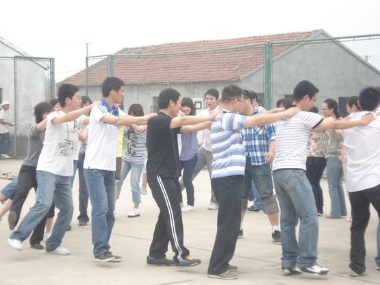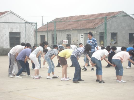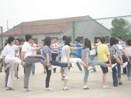 然后,拓展老师把大家分成三队,进行了“有轨电车”比赛活动。所谓有轨电车,其实就是两块长木板,5个人站在上面,并固定双脚于其上,同时迈动左右脚才能前进,稍有不同步就有摔倒的可能。这项游戏很好地考验了团队的团结的协作能力。