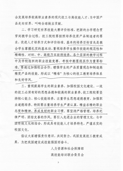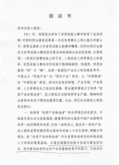 高联委在倡议书中提出:一要把培养“优质产品制造者”的办学理念放在首位;正确处理操作技能中快速与精良的关系,更加重视培养学生的产品质量精度意识和能力。二要学习研究世界技能大赛评价标准,把新的办学理念贯穿到教学全过程。形成以“精准”为核心的技工教育培养体系和良好学风。三要重视提高学生的职业素养,加强校园文化建设。特别要注重培养学生严肃认真、精益求精的职业态度和精神,养成良好的职业习惯。要坚持严格管理,培养纪律严明、团结友善的作风。