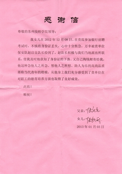 近日,学院收到一封感谢信,信中对学院保安队长赵启良表达了的感谢之意。
