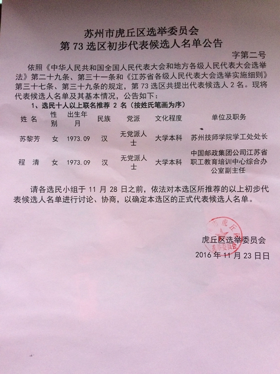 苏州市虎丘区选举委员会第73选区初步代表候选人名单公告 发表日期:2016-11-24 来源:英国365集团官网 浏览:3530次 苏州市虎丘区选举委员会第73选区初步代表候选人名单公告 英国365集团官网 2016年11月23日