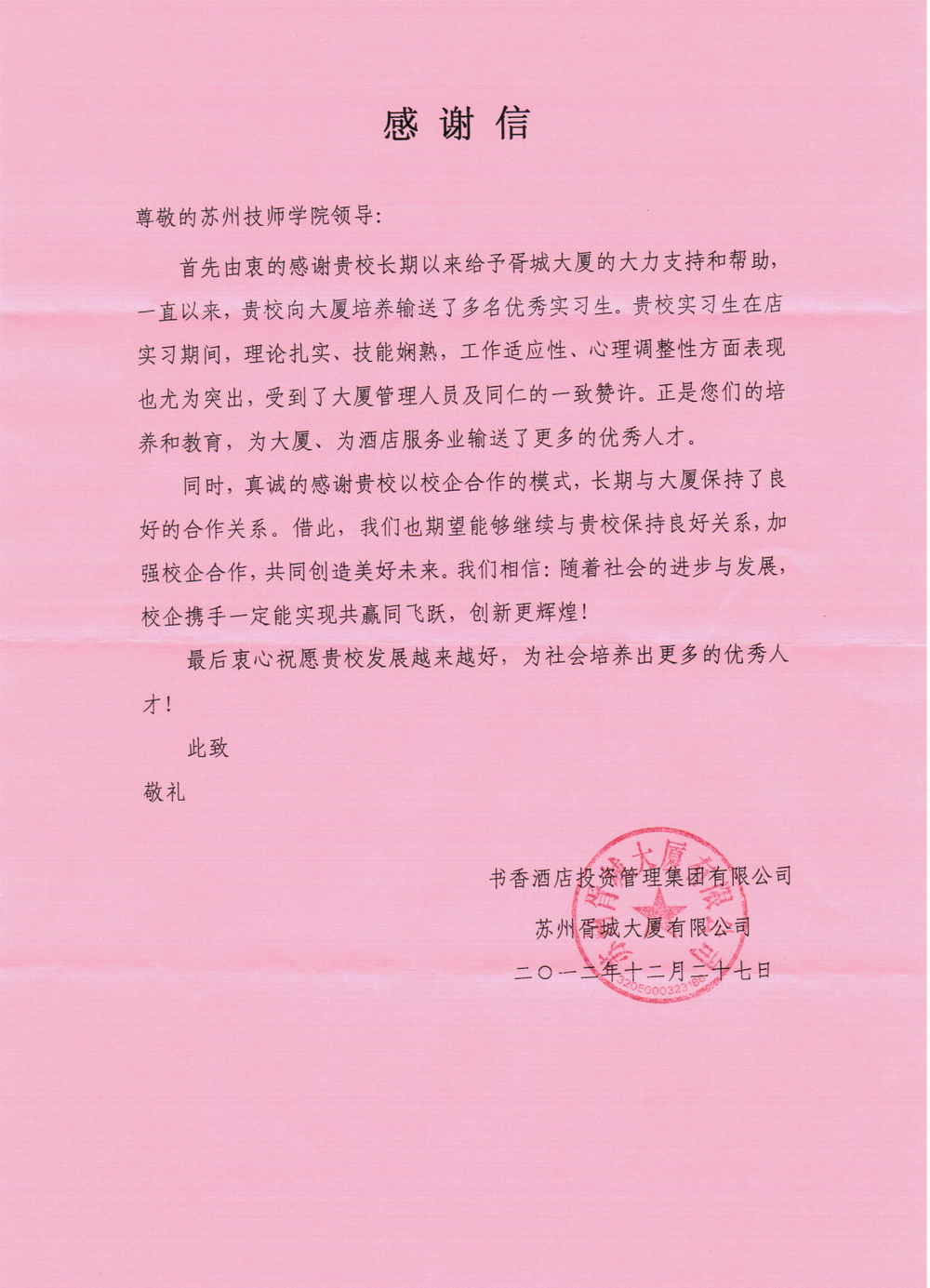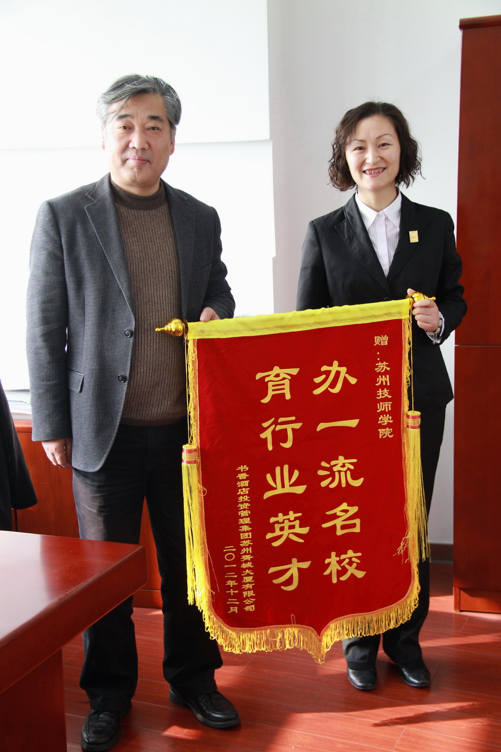 2013年1月9日上午,书香酒店集团苏州胥城大厦有限公司在此前对我院发来感谢信表达谢意的基础上,委派人事唐总监一行2人专程来到学院,为学院送上锦旗:“ 办一流名校、育行业英才” 。学院甘志雄院长热情接待了唐总监一行,并对书香酒店集团苏州胥城大厦有限公司此次赠旗表示感谢。
