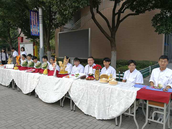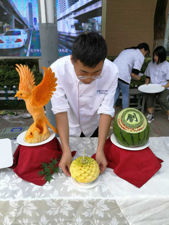 12点的校园,当大家都还沉浸在休闲的时光中,烹饪专业的黄佳斌老师和夏青老师便带着学生们为下午的活动开始了布展。瞧!展示台上龙飞凤舞、栩栩如生的食雕,学生们过硬的冷拼技艺和高雅的审美情趣,拼出了诗情画意的烹饪作品。还有那中国风的餐盘画,是我们黄老师专门用可食用的食材精心绘制的!都说台上一分钟台下十年功,从9月19日接到通知开始,烹饪组全体教师齐心协力从布展设计到食材准备再到最后的雕刻,从备战市技能大赛的百忙之中,加班加点完成展示作品的准备,作品惊艳,令参会代表团和全院师生纷纷驻足观赏称赞。