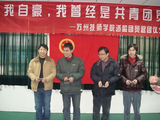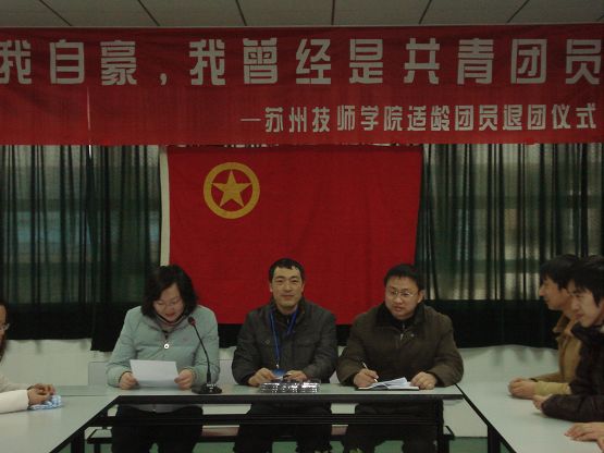 退团仪式在激昂的团歌中开始,院团委书记赵李华在热情洋溢的发言中充分肯定了老团员们在多年的教育、教学工作中所取得的成绩和所发挥的先锋模范作用,并向他们提出要求,希望他们向党组织靠拢,做到政治上积极上进、业务上精益求精。张晓老师代表退团教师讲话,表示绝不辜负党和团组织的殷切期望,争取早日加入党组织,发挥自己更大作用。