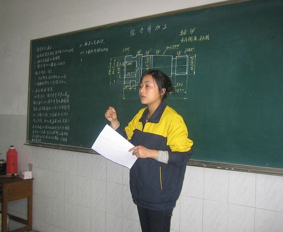 金雁老师的《车工技术》公开课课题是“综合件加工”,采用的是传统型讲授法和讨论法。金老师首先从对外圆、内孔、沟槽、锥度、外三角形螺纹等加工方法的复习,引出新课综合件加工。然后展示新课图纸,并介绍了相关工艺知识“外三角形螺纹加工”和“外锥加工”,在此基础上提出详细讲解了加工步骤及注意事项和要求。最后通过对学生上车床实际操作的巡视,进行讲评。通过老师的讲授和学生们的讨论,使得学生们很快并能根据图纸制定综合件的加工工艺步骤,并能合理选择切削用量,确保综合件加工的精度。