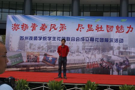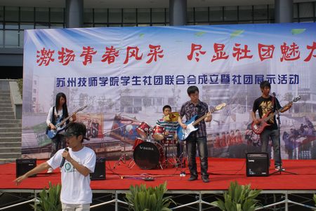 本着“激扬青春风采、尽显社团魅力”的主题,各主要社团在广场上搭起了帐篷,摆开了展台,把各自的主要特色、参加大型活动的照片等,以各式各样的形式展现给大家看,IT社现场修起了电脑,蓝馨文学社与大家共赏社员的精美短文……,与此同时现场还有舞台表演活动,乐队敲响了动感的音乐,弦木吉他社来了段弹唱,灵度魔术社大展玄机,舞蹈社带来美妙的舞蹈,跆拳道和散打社尽显团队和力量的无穷,礼仪社表了校园时装秀……