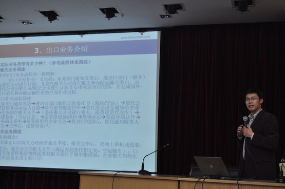 邢先生首先介绍了物流企业基本的货物进出口模式,并以苏州和上海为例,介绍了企业如何办理进出口业务,怎样获得最高利润。接着邢先生向现场同学介绍了合格报关报检员的标准,报关报检人员该如何正确的处理自己的工作以及怎样成为一名合格的报关报检员。最后,刑先生和现场同学进行了互动,解答了娄翠萍、李珍等同学提出的关于职业类院校毕业生进入进出口企业所必须掌握的技能及进出口企业一般提供的实习类岗位等方面的疑问,邢先生的详尽回答赢得了现场阵阵掌声。