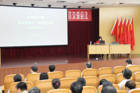 9月28日下午,学院举行了苏州市第十一次党代会精神报告会,动员和激励党员、干部和群众进一步统一思想,凝聚力量,围绕党代会确定的各项目标任务,以更加坚定的信心、更加扎实的举措,创造新业绩、实现新发展。报告由党代会代表,机电工程系王丽华同志主讲。