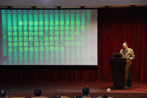 院党委副书记吴嘉程在指出,国学是中华民族五千年传统文化的智慧结晶,是圣贤留给国人的巨大精神财富。学习国学对于唤起文化自觉,恢复文化自信,实现文化认同,提高个人的文化素养,提高国民的精神生活水平,增强民族凝聚力以及建设和谐社会都具有重要的意义。他希望通过此次讲座,广大党员能自觉弘扬“天行健,君子以自强不息;地势坤,君子以厚德载物”的中华民族精神,树立以史鉴今,以儒做人,以道明德,以禅见性,以法御教的工作和生活理念,创造开放、日新的教学气蕴,促进“教”与“学”的互生相长。