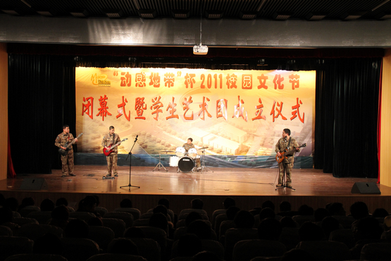 在我院学生艺术团成立仪式上,艺术团声乐部部长朱伟伟同学代表学生艺术团全体成员发言,吴嘉程副院长代表院部做了讲话,吴院长在致辞中充分肯定了我院近年来在学院文化建设方面所取得的成就,同时对艺术团今后的发展提出了殷切希望;甘志雄院长宣布我院学生艺术团正式成立,空军94906部队政治处刘洪印主任和学院甘志雄院长共同为我院学生艺术团揭牌。最后,2011校园文化节闭幕式文艺演出精彩上演。本次文艺演出由文化节获奖节目和学生社团经典节目组成,合唱、重唱、舞蹈、乐器、曲艺、诗朗诵……,教工合唱团和我院首个德育・国防基地空军94906部队穹窿乐队也为我们带来了精彩的表演,演出过程中,台上台下互动交流,节目美奂精彩,现场掌声如雷,气氛欢乐热烈。