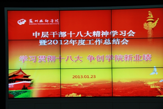 2013年1月23日下午,学院在国际会议厅召开了全体中层会议。会议的主题是“学习贯彻十八大,争创学院新业绩”。会议对2012年的工作进行了简要总结,提出了2013年的工作思路,对中层干部提出了学习贯彻十八大的具体要求。