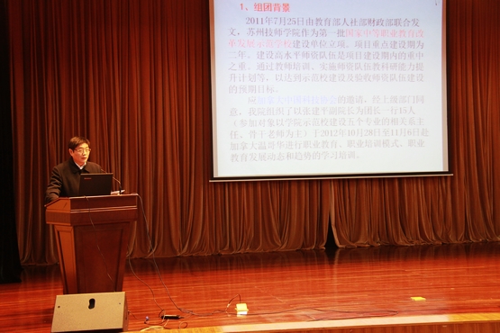 2012年,学院先后委派24名院领导、专业带头人及骨干教师赴新加坡、加拿大和德国考察学习。培训人员在学习过程中均感到在有限的时间里接触到了非常丰富的内容和先进的职教理念,对我院教育教学工作具有启发和借鉴意义,为了让广大教职工了解、感受国外职业教育的特点,学院举办了此次汇报会。