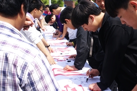 2013年5月3日下午1:00,学院组织召开了全体学生学风建设电视动员大会。450余名学生代表列席中心会场――会议中心2楼汇演大厅,其他学生在各自教室收看了电视直播。动员大会上,学生工作处苏黎芳副处长向全体同学宣读了学院2013【12号】文件――《关于印发英国365集团官网学风建设方案及实施意见的通知》,解读了学风建设年的五项制度和十大活动;院学生会主席高伟同学向全院学生发出了《从我做起,加强学风建设》的倡议书,倡议全体同学从五个方面积极参与学风建设,共同标榜起健康向上的学风大旗;学生工作处常灯铭处长就落实学院学风建设方案提出了具体要求,常处长号召全体同学从小事做起,从自我做起,从严格遵守学院各项规章制度做起,群策群力,把学风建设各项要求、活动落实到实处,共同开创我院学风建设的新局面。会后,千余名学生代表在“学风引我成长,博学慎思笃行”横幅上签名。