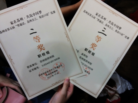 苏州市第五届暨“新东方杯”第三届“普通话、苏州方言、英语口语”比赛于10月19日在苏州教师活动中心举行。我院获苏州市职校组团体二等奖,一名选手获个人三等奖。