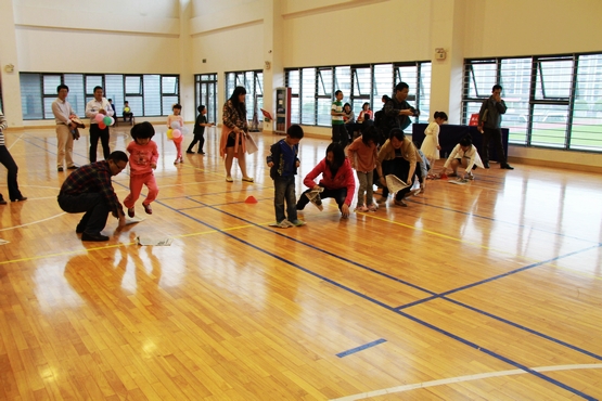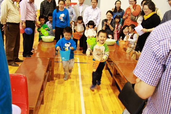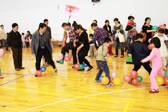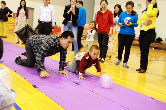 亲子活动项目丰富,备受小宝贝们的欢迎。瞧,这边10来个2、3岁的小宝贝正在比试谁爬得更快,只见一排排小屁股迅速地向前扭动,逗得一旁的家长哈哈大笑;而那边几个5岁左右宝贝和他们的爸爸(妈妈),每人脚上绑着几个气球,他们正在伺机干点“坏事”――踩破别人的气球,当气球被宝贝们成功 “爆破”的时候,场上场下同时传来兴奋的尖叫声;还有一些宝贝,站成一排,正在等待他们被蒙了眼睛的妈妈(爸爸)来“认领”,父母和宝贝们心有灵犀,总是一下子就能众里挑一,摸到自己的宝贝;10岁左右的大宝贝对爬行、踩气球、吹坐气球显然已经有点“不屑”了,他们和爸爸(妈妈)配合玩起了“二人三足”、“背靠背运球”等“高档”项目。