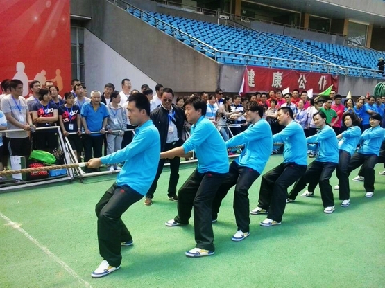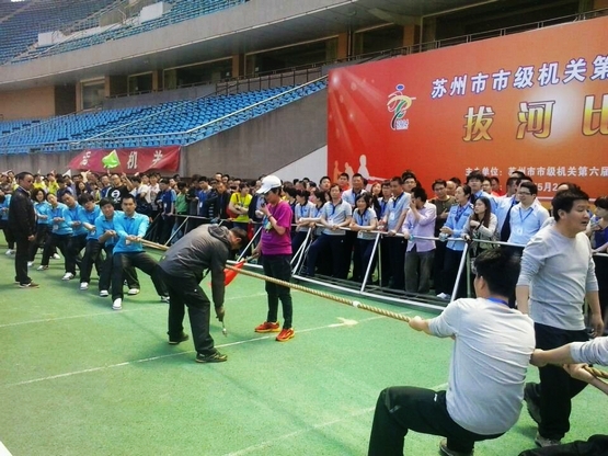 2014年5月23日,我院教师在工会的组织下代表人社局参加了在体育中心举行的市级机关第六届运动会拔河比赛项目。