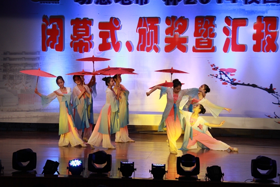 在甘院长致辞后,进行了文化节闭幕式汇报表演。此次汇报表演,突出了师生同台,共建校园文化环境这一主题。学生节目由校园文化节中的获奖选手参与演出。同学们放弃了休息时间,在指导老师们的精心指导下,节目质量得到了质的飞越。老师的节目更是体现了我院教职工多才多艺的一面,由教师代表姚静老师演唱的一首《我的祝福,你听见吗》,让现场观众掌声不断;而班主任代表印鸣杰老师的萨克斯独奏《回家》更让人听得如痴如醉,久久不能自已;而院教工舞蹈社团的舞蹈《美丽的雪山姑娘》将整个会场气氛掀起了一个高潮。院领导为老师们的精彩表演起立鼓掌。整个汇报演出精彩纷呈、高潮迭起,最后一首由陆雯老师指挥、院合唱团演唱的《时间都去哪儿了》余音绕梁,让人久久回味。演出结束,院领导亲切慰问了所有演职人员,并与大家合影留念。