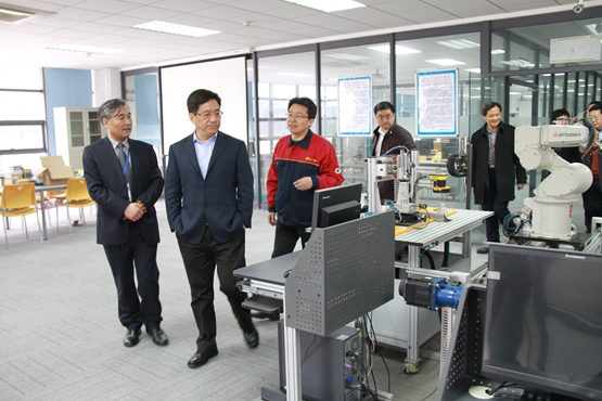 在学院领导陪同下,徐副市长一行参观了我校数控、西门子、轨道交通和传统工艺实训室,听取了实训室建设、教学实训模式、校企合作工作等方面的情况介绍。