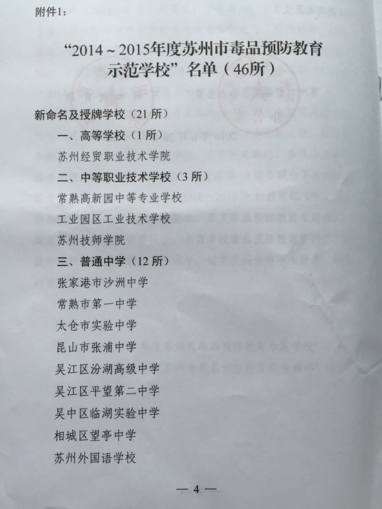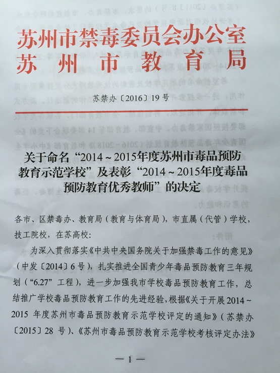 无毒青春,健康生活------我院获“2014-2015年度苏州市毒品预防教育示范学校”