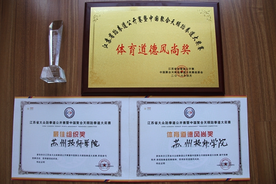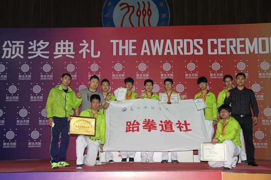 4月30日~5月2日,我院跆拳道社参加了由江苏省跆拳道协会在徐州--九州职业技术学院举办的“江苏省大众跆拳道公开赛暨中国聚合天颐跆拳道大奖赛”,经过为期三天的激烈角逐,我院跆拳道社取得了4金4银5铜和2个第五名的好成绩,学院荣获最佳组织奖和体育道德风尚奖。