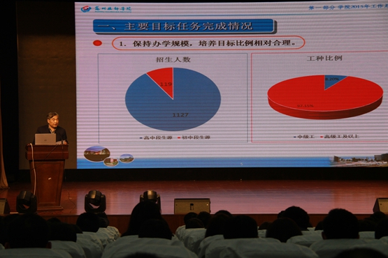甘院长全面总结了2015年各项工作。2015年是学院“十二五”的收官之年,学院继续秉承“多元办学、内涵发展、服务社会、塑造品牌”的办学理念,对照国家重点技师学院标准,创建国家一流技师学院,使各项工作取得了较好成绩:生源质量明显提升,教学教改不断深化,师资队伍显著加强,公共实训基地实力提升,学生德育工作深化,后勤服务到位,财务运行状况良好。