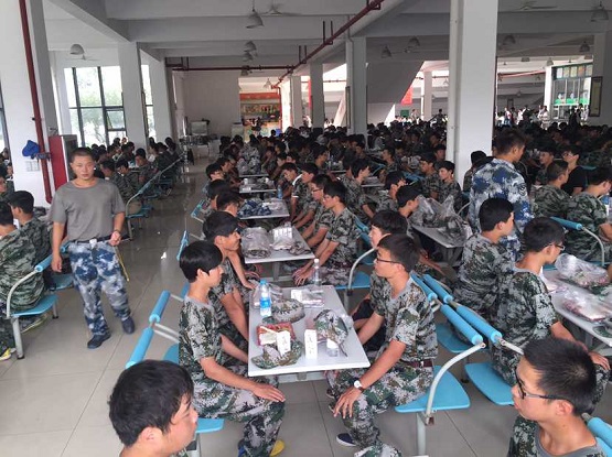 每日上午军训结束,当各班排着整齐的队伍到食堂时,后勤处、食堂工作人员已经为他们精心准备了合理膳食,在嘹亮的“团结就是力量”军歌声后统一就餐,整个过程安静、文明、有序。