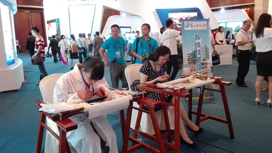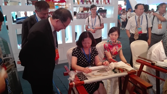 中国和东盟互为近邻,文化相近,人民相亲,人文交流源远流长。中国政府高度重视中国―东盟人文交流。中国―东盟教育交流周是主动融入“一带一路”国家战略、提高教育国际化水平的高端平台,为深化人文交流、增进理解共识、促进国家间友好发挥了重要作用。我院在此次博览会上展出了一部分刺绣作品。学院特聘的苏绣指导教师王玉英、刺绣专业学生刘婷亚在现场飞针走线,展示苏绣技艺,吸引了国内外来宾驻足观看,啧啧称奇。