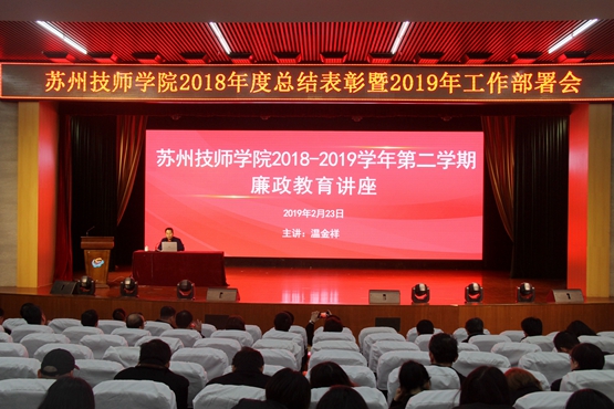 首先,学院邀请苏州市纪委派驻人社局纪检组温金祥组长作廉政讲座。温组长以春节期间纪律监察情况为切入点,就近期召开的十九届中央纪委三次全会、江苏省纪委四次全会及苏州市纪委四次全会进行会议精神解读,并分享了纪检工作的认识和体会。此外,他还就公职人员违纪及职务违法、犯罪的方式、人员类型等进行具体讲解,明确公办教育单位从事管理的人员为被监察对象,并结合我院的具体实际对教职工进行廉政教育,筑起校园廉政警戒线。
