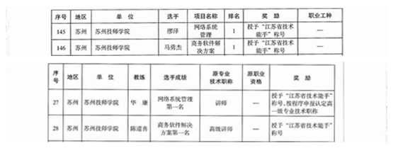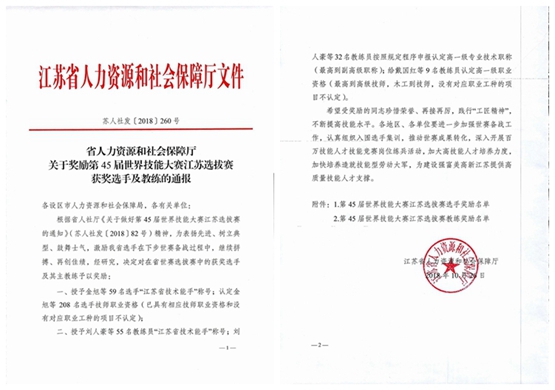11月8日,我院接到喜报,省人社厅为表扬先进,树立典型,激励选手在下一步备战45届世赛过程中继续拼搏、再创佳绩,决定对在省世赛选拔赛中获奖的选手及主教练予以奖励。我院信息工程系学生马勇杰、缪泽,教师陈道喜、华康均被授予“江苏省技术能手”称号。