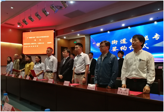 签约仪式现场,街道办事处与我院签订《“枫桥街道技能专班”项目定向委托培养协议》,并与其辖区内参与合作的12家企业签订《“枫桥街道技能专班”项目合作框架协议》。