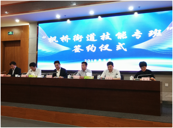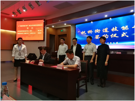 5月25日上午,我院顾正明院长、余新利副院长、招生就业处毛锡锋处长一行前往枫桥街道,在马涧市民服务中心参加“枫桥街道技能专班”(以下称“技能专班”)签约仪式。