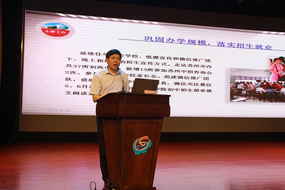 会议中,顾院重点介绍了学院上半年目标任务完成情况,及落实从严治党、紧扣教育教学、强化队伍建设、深化教学改革、巩固办学规模、重视立德树人、推进社会培训、规范安全服务等一系列主要工作的进展情况,并对高标准完成接待世界技能组织官员参观学院活动中涌现的好人好事进行了通报表扬。在充分肯定大家的成绩和奉献的同时,顾正明院长向全校教职工提出四点要求:一要解放思想,敢拼敢闯;二要转变作风,追求实效;三要凝心聚力,展现活力;四要改革创新,干出实绩。