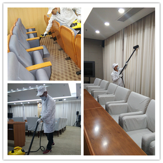 专业人员对各个会议厅的地毯、窗帘和座椅采用高温蒸汽吹洗;对室内空间采用雾化器进行了雾化熏蒸,将化学药物通过高科技处理后达到消除螨虫、破坏有害虫卵、杀灭蚊虫等有害生物的目的。切断病原体的传播途径,提高公共场所的卫生质量。