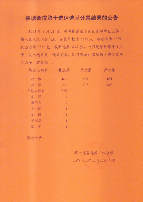 横塘街道第十选区选举计票结果公示