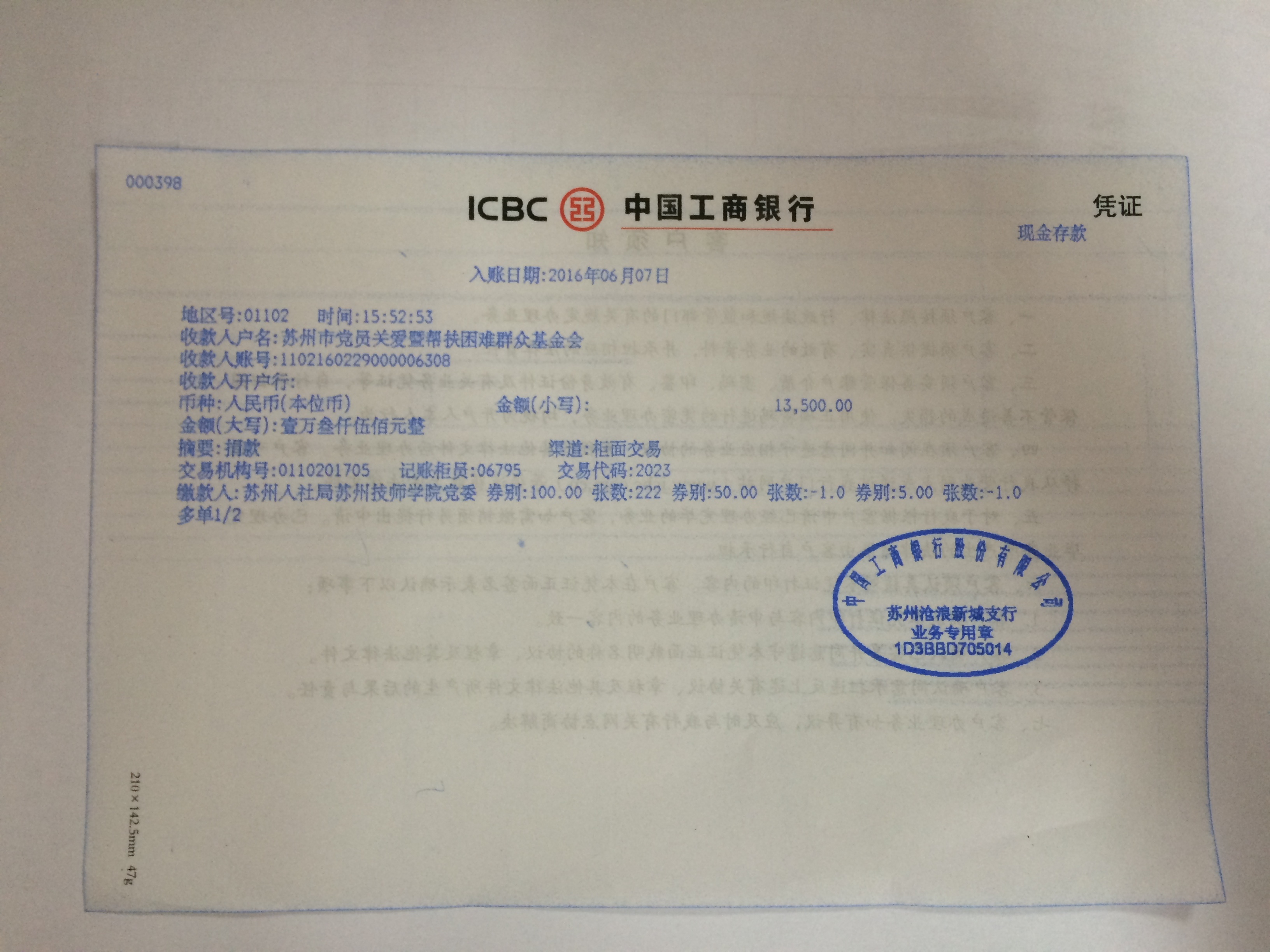 | 捐款合计 | 人民币13500元(壹万叁仟伍佰圆整) | |||||||