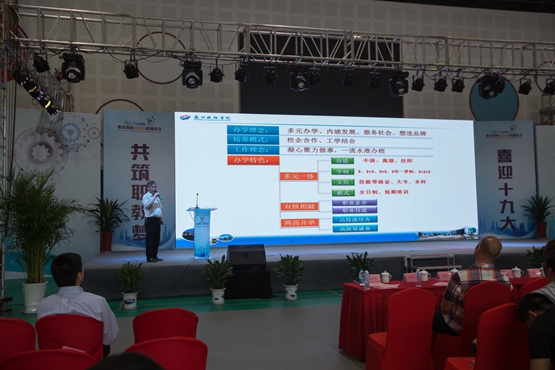 在曹市长宣布活动周启动后,职业教育活动周启动仪式完美落幕。随后的校企合作大讲坛,我院院长甘志雄作为嘉宾之一发言,甘院长重点介绍了我院校企合作三大模式:一是“教学实施五对接”(人才培养目标与企业需求目标对接,课程设置与工作岗位任务对接,课程内容与生产产品对接,教学过程与生产过程对接,实训环境与企业环境对接);二是“人才培养五创新”(应急培养、项目培养、攻关培养、互联培养、竞赛培养);三是引企入校,引产入教,以最佳途径提高培养质量等内容向在场人员作了生动报告,赢得广泛赞同。