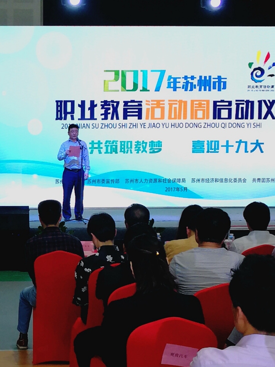 下午2:00,职业教育活动周启动仪式在市教育局高国华副局长的主持下正式开始。本次职业教育活动周以“共筑职教梦,喜迎十九大”为主题,突出技术技能重要地位,大力弘扬工匠精神。市教育局张曙局长全面介绍了第三届苏州市职业教育活动周情况,随后举行了隆重的首批“苏州市定点实习企业”和“校企合作示范组合”授牌仪式。经过层层筛选,我院两家报送企业――苏州轨道交通集团有限公司运营分公司和苏州斯莱克精密设备有限公司均获殊荣。作为在苏州地区极有影响力的轨道交通公司,被主委会指定为唯一发言的代表企业,矫书记就校企双方合作以来取得的成绩,如定向合作培养、提供实习就业、共建实训基地、共制育人机制、师资互聘等情况向出席领导及嘉宾作了汇报。