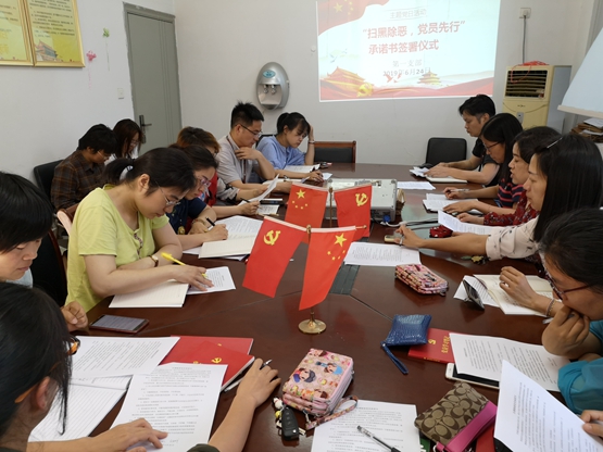 按照市委组织部文件的要求,第一党支部前期组织支部党员进行了扫黑除恶专项斗争知识专题测试。主题党日活动上,支部组织委员王艾荣同志从“黑”“恶”的属性,“扫黑除恶”的重要意义、基本原则、工作要求以及黑恶势力常见罪行解释和相关法律知识等方面为大家开设了一堂专题党课。接着,与会党员同志认真观看了公安部《扫黑除恶》主题宣传片,现场签订了《扫黑除恶党员承诺书》。党日活动的最后,常灯铭书记要求全体党员深入落实学院党委“党建+”工作的要求,结合支部党员与群众教师“1+1”互帮互助活动,开展扫黑除恶专项斗争宣传,努力营造扫黑除恶专项斗争全面动员、全民知晓、全员参与、全社会检举揭发黑恶势力的浓厚氛围。