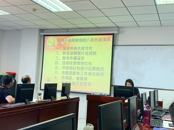 接着,支部副书记米丽萍同志带领大家对《关于规范党员干部网络行为的意见》进行了深入学习,对其实施的重大意义、内涵和内在要求进行了讲解。要求全体党员干部在网络上,要严守政治纪律和政治规矩,不准参与违背党规等网络传播行为,不得参加党组织等明确禁止的网络活动;要严格规范以职务身份在网络平台注册账号行为;要积极履行举报监督义务;要切实加强对党员干部网络行为的教育、引导和管理。同时,她针对党员干部用微信的八条负面清单进行逐一讲解,希望大家引起警惕。