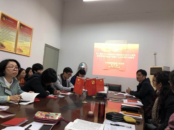 学好新时代新思想开好头,贯彻落实十九大精神起好步 11月14日下午,第三支部组织全体党员开展学习贯彻落实党的十九大精神主题会议,支部书记常灯铭同志开设了题为《学习领会习近平新时代中国特色社会主义思想,贯彻落实党的十九大精神》的党课。 党课中,常灯铭书记首先回顾了党的十九大的盛况,简介了习近平总书记代表十八届中央委员会向大会作的《决胜全面建成小康社会夺取新时代中国特色社会主义伟大胜利》报告的主要内容。其次,带领支部全体党员重点学习了习近平新时代中国特色社会主义思想;他从习近平新时代中国特色社会主义思想形成的现实背景、主要内容、重大意义等方面带领支部党员深入学习领会新时代新思想,着重学习了八个明确的主要思想及十四个坚持的基本方略。党课的最后,常灯铭书记结合自身工作实际,谈了如何自觉学习领会习近平新时代中国特色社会主义思想,深入贯彻落实党的十九大精神的初步体会。 主题学习会的最后,常灯铭书记对支部继续深入贯彻落实党的十九大精神作出了布置,他要求支部全体党员同志要将深入学习贯彻落实党的十九大精神作为一项最重要政治任务放在学习工作的首位;要把握好“五个聚焦”的着力点,特别是要把握好“聚焦到习近平总书记是全党拥护、人民爱戴、当之无愧的党的领袖上”的重要意义;要将学习贯彻落实党的十九大精神与自身工作实际相结合,以新思想为指导,立足本职岗位,发挥先锋模范作用,为新时代新目标新征程贡献自身力量。 本次主题学习会开启了支部学习贯彻落实党的十九大精神的新征途,为支部党员牢记初心,不忘使命,继续前进奠定了扎实的基础。 第三支部 2017年11月15日