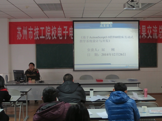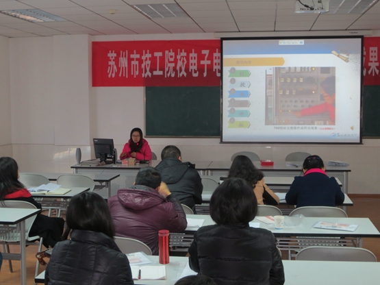 会上,中心组组长许志刚老师作了电子电工中心教研组的年度总结报告,然后会议就今年的教学成果进行了交流。江苏省技工院校2014年度优秀论文一等奖获得者陆雯老师介绍了怎样在教学过程中开展以任务驱动为导向的“角色扮演”法教学,并介绍了论文形成的过程和主要写作思路;省电子电工年会课件一等奖获得者屈刚老师就课件《T68镗床教学系统1.04》中的软件开发与使用同与会教师作了介绍和交流。