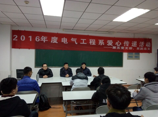 2017年1月5日中午,电气工程系在6C304进行了一场以“传爱心、显真情”为主题的爱心传递活动。活动由院第五支部书记刘红星主持,学院党委副书记吴嘉程也出席了本次活动。