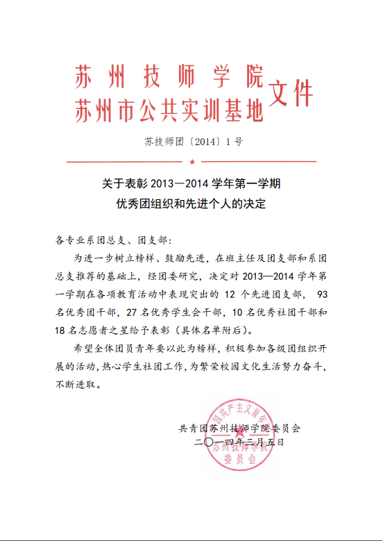 关于表彰2013-2014学年第一学期优秀团组织和先进个人的决定