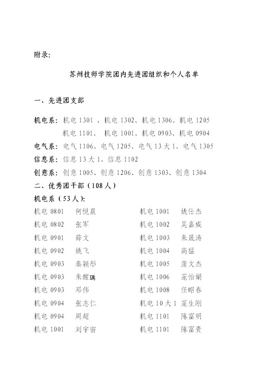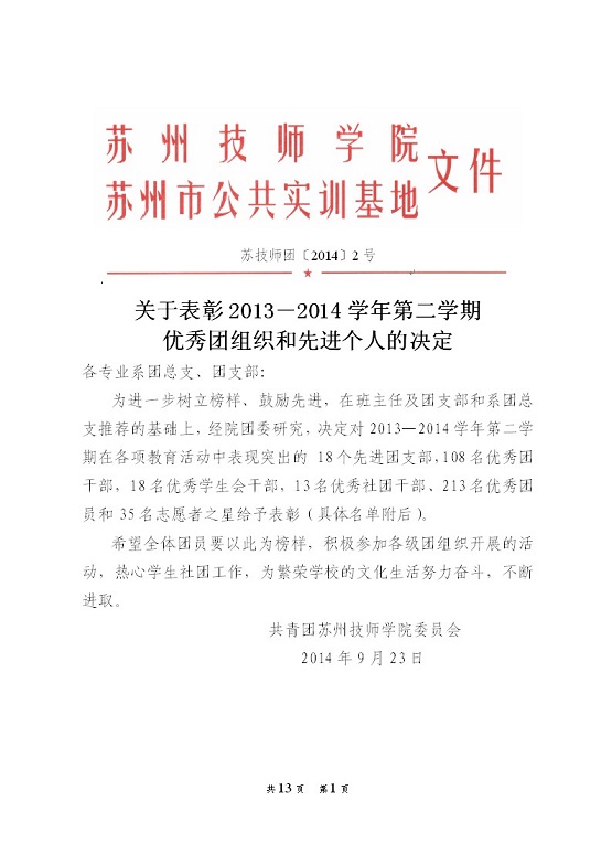 苏技师团(2014)2号文-关于表彰2013-2014学年第二学期优秀团组织和先进个人的决定