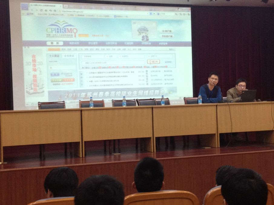 太仓市人社局来我院进行3D网络招聘平台应用说明会 登录网站,选择一个角色扮演,进入3D虚拟招聘会现场,你就可在任何一个摊位前投简历,还能接受视频面试……如果你以为,这是一款网络游戏,那就大错特错了。这是太仓日前研发上线的新型招聘网站――“中国公共人力资源市场在线”。这也是全国上线启用的首个“3D网络招聘会”。2013年4月10日下午,太仓市人力资源和就业社会管理处施副主任一行三人,专程到我院就该网站进行了专场说明和演示,招生就业处处长赵一敏、各系实习管理员和部分老师及学院100多位学生代表参加了说明会。 “中国公共人力资源市场在线”是国家人社部信息中心“人力资源社会保障信息化建设实践应用基地”研发的一个全国性新型招聘网站,融网站版、3D虚拟现实版、手机版“合三为一”,集多平台、多端用户为一体,旨在以实时的职位发布,便捷的简历搜索,易用的招聘工具,诚信的品牌服务,满足用户全方位的招聘需求。 “中国公共人力资源市场在线”引入了全新3D技术,模拟了真实招聘现场,多角度展示各地城市概况、产业结构、居住环境、人文关怀、人才政策等,提供真实、动态、及时、所需的信息,通过职位搜索、现场现场投简历、视频面试等方式实现远程在线应聘。而对于那些不方便电脑上网的求职者,中国公共人力资源市场在线提供手机版招聘求职软件,可通过二维码扫描免费下载,并提供职位搜索、校园招聘等多种服务。