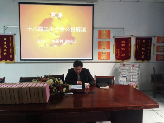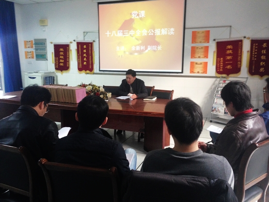 会上,余新利副院长首先介绍了十八大三中全会公报出台的背景。接着,余新利院长从制度方面、经济方面、民生方面、行政领域、法治领域等方面对公报内容一一进行了解读。指出该决定的出台是一个措施性的决定;是一个敏感性的规定;是一个务实、落实的决定;同时也是一个勇于挑战的决定。最后,余院长提出了几点要求:要求每一名党员教师都要加强学习,以十八大三中全会精神武装自己;在实际工作中认真贯彻落实十八届三中全会精神,进一步增强自身素质和责任意识,把思想和行动统一到全会精神上来。